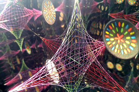 光を通すと……あわせ鏡の原理によって、幾何学的な美しい光の模様が浮かび上がります。