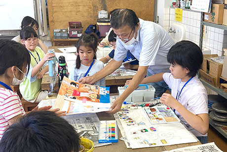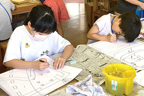下書きの完成後、絵の具やクレヨンを使って色を塗っていきます。